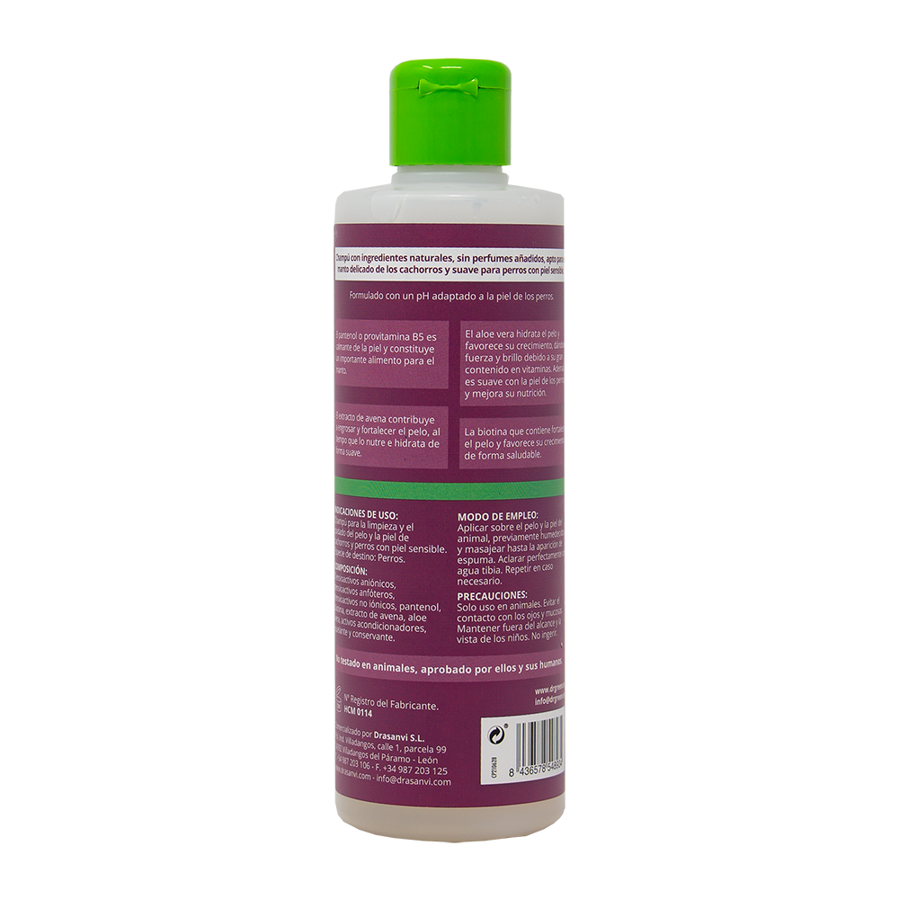 Șampon cu ingrediente naturale, fără parfumuri adăugate, potrivit pentru blana delicată a cățeilor și cu acțiune delicată pentru câinii cu piele sensibilă.